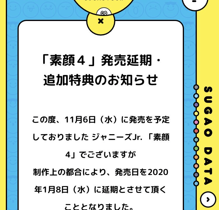 2019年11月6日に発売を予定していたジャニーズJr.の「素顔4」の発売が2020年の1月8日に延期されたということが発表されました。