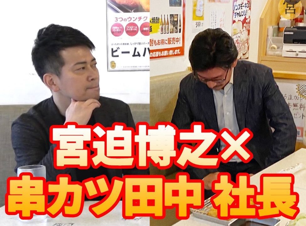 [youtube https://www.youtube.com/watch?v=mo6GMV897MA?start=1317] 宮迫さんが自分のYouTubeチャンネル「宮迫ですッ!」で、串カツ田中を訪れたのがきっかけです。社長の貫啓二さんとは以前からお知り合いだそうで、宮迫さんも飲食店を経営していることもあり、コロナの影響で営業が厳しい飲食業界について対談しています。