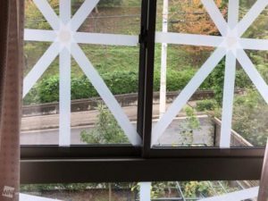 図のように窓ガラスの縦・横・斜めに「米」の字になるよう養生テープを貼ることが基本のようです。